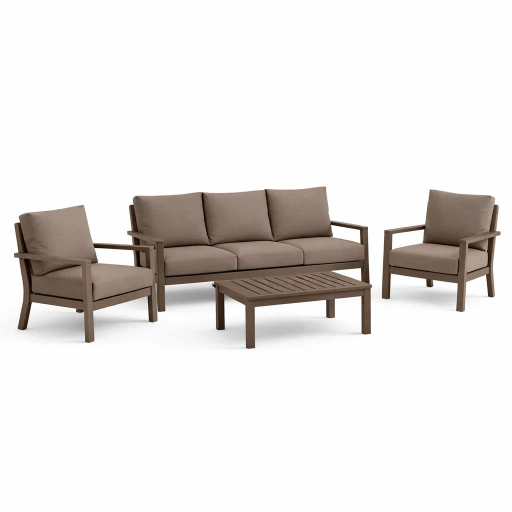 Matériaux: Cadre en aluminium, coussins en mousse polyuréthane avec housse en polyester.