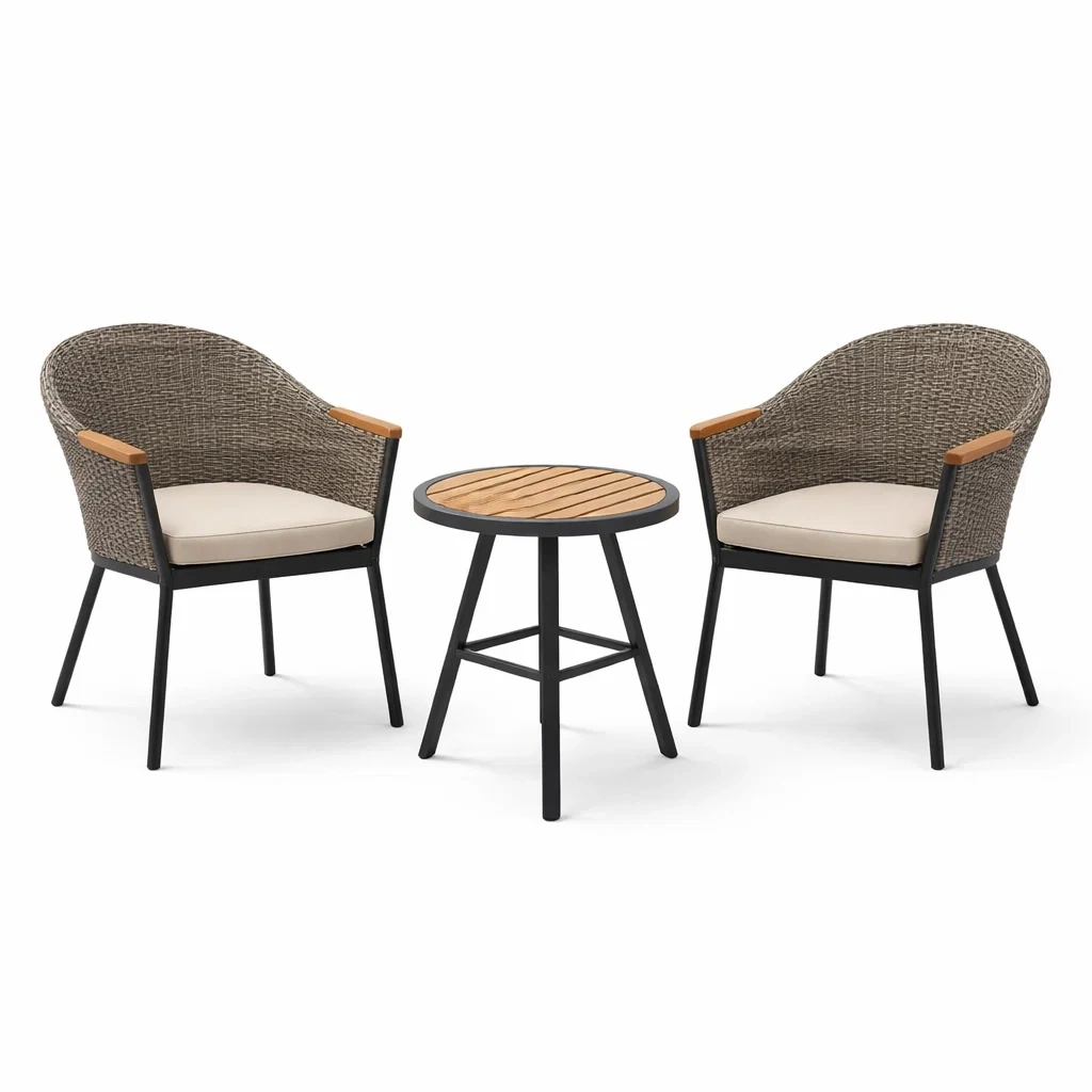 Ensemble composé d'une table et de deux chaises. La structure est en acier. Les surfaces des chaises sont en résine tressée, avec des accoudoirs en bois. Les coussins sont en polyester beige, avec des dimensions de 50 cm x 45 cm x 5 cm. Dimensions de la chaise : 62 cm x 60 cm x 85 cm. La table a un diamètre de 50 cm et une hauteur de 45 cm. Utilisation : intérieur/extérieur.