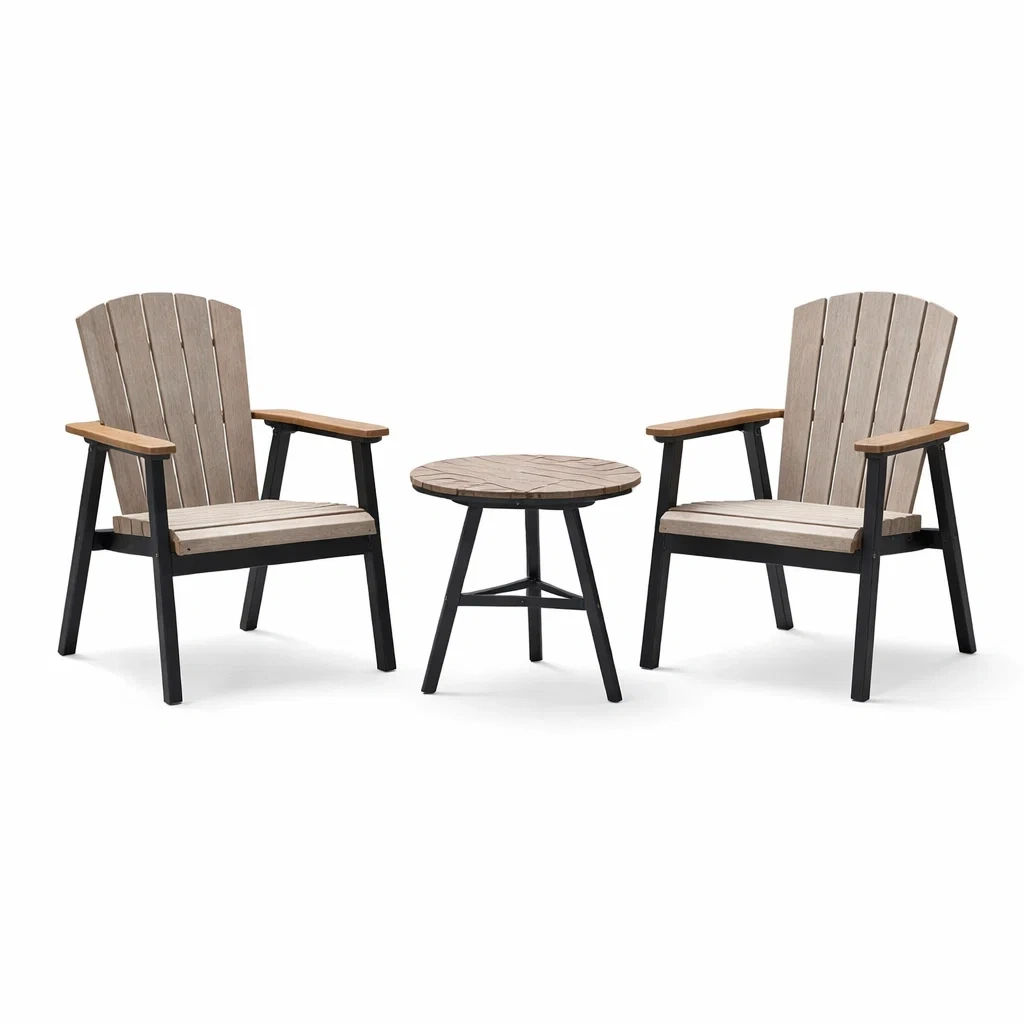 Matériaux : Bois composite pour le plateau de la table et les sièges, acier pour les cadres.